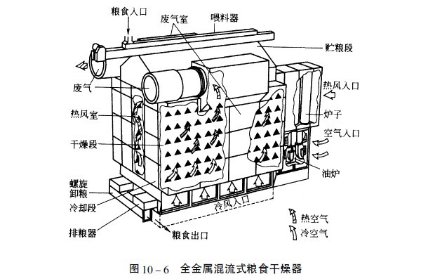 混流式谷物干燥機(jī)是目前國(guó)際上應(yīng)用最廣泛的一種谷物干燥設(shè)備。它的特點(diǎn)是熱風(fēng)流向與糧食流向的關(guān)系較為復(fù)雜,既有順流也有逆流和橫流。由于它的通用性好,電耗低,干燥質(zhì)量好而日益得到發(fā)展(見(jiàn)圖10-5)。 一、特點(diǎn) 1、干燥機(jī)機(jī)體可以采用積木式結(jié)構(gòu),設(shè)計(jì)成標(biāo)準(zhǔn)塔段,利用增減塔段改變干燥機(jī)的生產(chǎn)率,因而便于系列化,放大或縮小機(jī)型。 2、由于谷層厚度比橫流式小,與順、逆流干燥機(jī)相比糧層更薄,故氣流阻力小,因而風(fēng)機(jī)的風(fēng)壓小,單位電耗的生產(chǎn)率高。 3、對(duì)物料的適用性好,可以烘干小粒種子,如油菜籽、谷子、芝麻等。 4、由于干燥塔內(nèi)交替布置著一排排的進(jìn)氣和排氣角狀盒,谷粒按照% 形曲線向下流動(dòng),交替受到高溫和低溫氣流的作用,因而可以采用比橫流式干燥機(jī)高一些的熱風(fēng)溫度。隨著風(fēng)溫的提高,蒸發(fā)一定量的水分所需的熱風(fēng)量也相應(yīng)減少,單位熱耗降低。使用的風(fēng)機(jī)也可以小一些。 5、從熱風(fēng)和糧食的相對(duì)運(yùn)動(dòng)來(lái)看,混流干燥過(guò)程相當(dāng)于順流逆流交替作用,因此稱為“混流”式干燥機(jī)。 二、結(jié)構(gòu) 混流干燥機(jī)由于內(nèi)部角狀盒的形狀、尺寸、排列方法、進(jìn)氣道與排氣道的布置等不同,可分為若干類型。這里重點(diǎn)介紹兩種類型。 (1)整體式國(guó)內(nèi)糧食系統(tǒng)使用較多的是五角形通氣盒,平行排列,隔層進(jìn)出氣這一類型其塔身為整體式,多為磚、水泥結(jié)構(gòu),保溫性能較好。五角狀氣道以一定排列方式固定在塔的兩壁上,一端封閉,另一端開(kāi)口,開(kāi)口在進(jìn)氣一側(cè)的是進(jìn)氣角狀管,開(kāi)口在排氣一側(cè)是排廢氣角狀管。谷物從干燥塔的頂部溜管進(jìn)入,多余的谷物從回糧管流出。進(jìn)入烘干塔的谷物,先經(jīng)過(guò)貯糧段,然后到烘干段被熱空氣(或煙道氣)烘干,再經(jīng)過(guò)隔離段到冷卻段,經(jīng)過(guò)冷卻的谷物進(jìn)入排糧段被排出。 (2)組合式它采用全金屬結(jié)構(gòu)(見(jiàn)圖10-6),此類型的混流干燥機(jī)的特點(diǎn)如下。 1、組合式結(jié)構(gòu)便于系列化生產(chǎn),各系列組合段的長(zhǎng)和高相等,只是寬度不同。可根據(jù)用戶不同的要求組合而成。 2、每個(gè)組合段為矩形,橫向開(kāi)底的風(fēng)管分層排列,每層風(fēng)管由幾條管道組成,進(jìn)氣層與排氣層相互交替。在同一層所有管道向糧塔送入熱空氣,而該層管道的上下相鄰的兩層管道,都是排氣的管道。為了有助于氣流的均勻分布,各管道截面是由大變小的錐形,在進(jìn)氣一端的橫截面積最大,而后逐漸縮小,到最遠(yuǎn)的另一端最小。 3、側(cè)壁采用剛度大的鋼板,設(shè)有百葉窗。 4、側(cè)壁上裝有易裝卸的門。