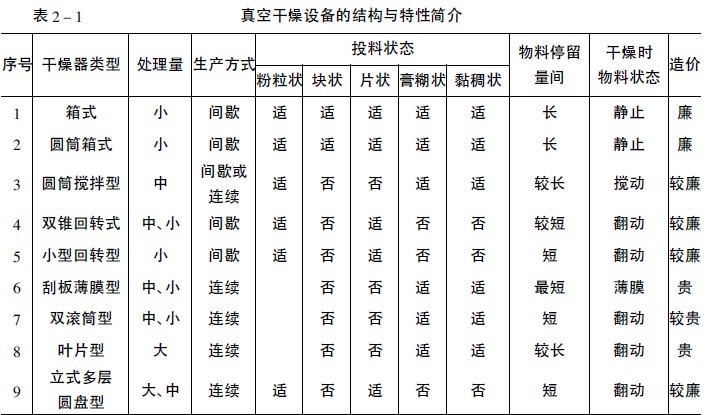 真空干燥就是通過降低干燥室的壓力以降低濕分的沸點,達到在低溫下干燥的目的。工業干燥設備按其加熱方式可分為傳導式和對流式兩大類。回顧工業干燥設備的發展,又可分為幾個階段,五十年代以前,主要是以傳導式(例如箱式烘箱、真空干燥箱)為主。從手工裝卸料發展到半機械化、機械化和連續式干燥。五十年代以后,干燥技術的開發為滿足工業干燥的處理量大、高效、連續化、自動化的要求,重點進行了對流式干燥設備的研究和開發。到七十年代初,對流式干燥設備已取代傳導式干燥設備的主導地位。但隨著工業的發展,在節能、環保、潔凈等方面,對干燥設備提出新的要求,而這些又是對流式干燥設備一時難以解決的要求,因而傳導式又得到新的發展。從七十年代到八十年代初,各種新型的傳導式干燥設備(例如多層帶式真空干燥設備、雙錐回轉干燥設備、葉片式、振動式干燥設備等)取代對流式干燥設備逐漸增多。當然為適應對節能、環保、潔凈的要求,對流式也在設法加以改進,例如將傳導式加熱面與流化干燥設備結合起來等等。 真空干燥設備屬于傳導式干燥,即將冷凝器、真空泵與傳導式干燥設備配套,形成真空干燥裝置。 由于真空干燥具有干燥溫度低、干燥速率大、節能、沒備密閉防污染等特點,因而傳導式干燥設備大部分可設計成真空干燥裝置。真空干燥在生物制品、藥品、飲品以及熱敏性物料、氧敏性物料、溶劑回收待干燥中起到獨特作用。 真空干燥設備的分類介紹如下: 隨著工業技術的不斷發展,大多數采用密閉和接近密閉型的常壓干燥設備都被設計成真空干燥設備。種類繁多,結構各異。其分類方法也不相同。按操作方式分,則可分為間歇式和連續式;按干燥過程中物料的狀態分,則可分為靜止型、翻動型、攪動型和振動型;按干燥機理分,可分為蒸發型和升華型。由于真空干燥設備能用較低的溫度得到較高的干燥速率,能在低溫下干燥熱敏性物料,也可以干燥氧敏性物料。或有燃燒危險的物料,適用于干燥含有溶劑或有毒氣體的物料。溶劑回收容易,能將物料干燥成很低的水分,并可用于低含水率物料的進一步干燥,使真空干燥技術得到很大發展。因而成為目前干燥設備中主要類型之一。 工業上使用的真空干燥設備約有二十幾種,表2-1將常見的十多種真空干燥設備按結構分類進行介紹。