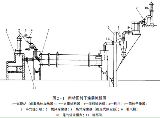 回轉圓筒干燥設備的總體結構設計 回轉圓筒干燥設備是一種處理大量物料干燥的干燥設備。由于運轉可靠、操作彈性大、適應性強、處理能力大,廣泛使用于冶金、建材、輕工等部門。在化工行業中,如硫酸銨、硫化堿、安福粉、硝酸銨、尿素、草酸、重鉻酸鉀、聚氯乙烯、二氧化錳、碳酸鈣、磷酸銨、硝酸磷肥、鈣鎂磷肥、磷礦、普通過磷酸鈣、重過磷酸鈣、磷酸三鈉、三聚磷酸鈉等的干燥,大多使用回轉圓筒干燥設備。 回轉圓筒干燥設備生產流程如圖2-1所示。