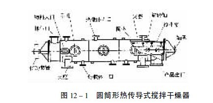 熱傳導(dǎo)式攪拌干燥設(shè)備依據(jù)攪拌槳葉的結(jié)構(gòu)有圓筒形攪拌槳葉干燥設(shè)備,螺旋形攪拌槳葉干燥設(shè)備,管形攪拌槳葉干燥設(shè)備,圓盤攪拌槳葉干燥設(shè)備,楔形攪拌槳葉干燥設(shè)備和捏合式攪拌槳葉干燥設(shè)備等。 1、圓筒形攪拌槳葉干燥設(shè)備圖12-1所示為一種圓筒形干燥設(shè)備。在水平安裝的帶有夾套的圓筒體內(nèi),沿設(shè)備中心設(shè)置一根旋轉(zhuǎn)軸,軸上裝有許多攪拌槳葉,軸的兩端由筒外兩側(cè)的軸承支撐。加熱面為圓筒夾套,中心旋轉(zhuǎn)軸內(nèi)為不同熱載體。在物料出口處可以通過改變攪拌槳葉方向和角度來調(diào)節(jié)物料在筒內(nèi)的滯留時間。 2、螺旋形攪拌槳葉干燥設(shè)備此類型干燥設(shè)備是在水平螺旋輸送器的基礎(chǔ)上,筒體上增設(shè)夾套,內(nèi)通載熱體改設(shè)而成。物料在絞龍輸送的同時達到加熱干燥的目的。螺旋輸送器可以是單軸的也可以是雙軸的。