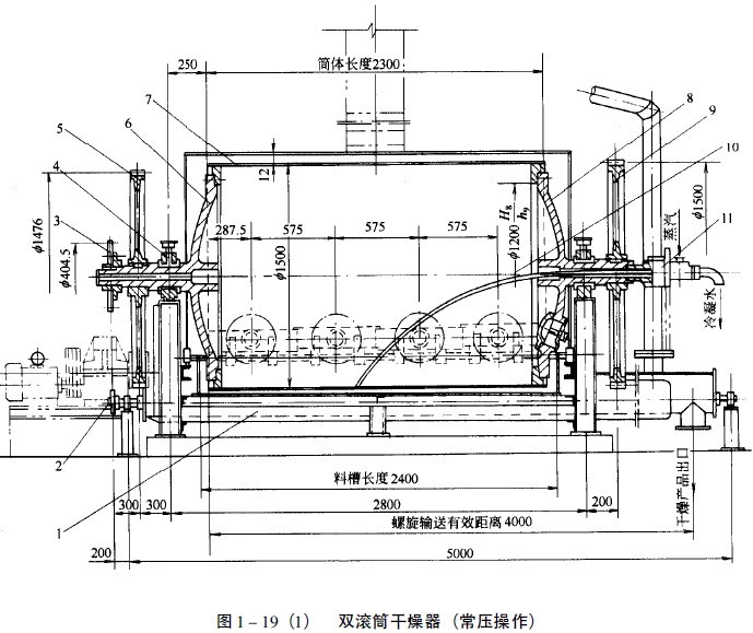 一、結(jié)構(gòu)組成和總體設(shè)計 1、用于液相物料干燥的單滾筒滾筒和雙滾筒干燥設(shè)備,其結(jié)構(gòu)均可歸納為以下組成部分。 (1)滾筒干燥設(shè)備的滾筒(包括筒體、端蓋、端軸及軸承)。 (2)布膜裝置(包括料槽、噴濺器、攪拌器、膜厚控制器)。 (3)刮料裝置(包括刮刀、支承架、壓力調(diào)節(jié)器)。 (4)傳動裝置(包括電動機、減速裝置和傳動件)。 (5)進氣與排液裝置(包括進氣頭和管路附件)。 (6)滾筒干燥設(shè)備支架與密封罩。 (7)干燥產(chǎn)品輸送和最后干燥設(shè)備。 圖1-18為常用的單滾筒干燥設(shè)備結(jié)構(gòu),圖1-19為雙滾筒干燥設(shè)備結(jié)構(gòu)。 2、總體設(shè)計包括以下方面。 (1)確定滾筒干燥設(shè)備型式和筒徑、筒長及滾筒轉(zhuǎn)速根據(jù)工藝要求處理的物料量、濕含量指標(biāo),經(jīng)物料和熱量衡算,在已知料膜干燥時間、蒸發(fā)強度和傳熱速率等設(shè)計參數(shù)的基礎(chǔ)上,確定滾筒干燥面積。依據(jù)工藝設(shè)計的流程,設(shè)備和配套在廠房的配置要求,初步確定進料、布膜、出料和供熱的方式與布置。在以上條件下,做出干燥設(shè)備的選型并計算筒體直徑、長度和轉(zhuǎn)速。在確定筒徑和轉(zhuǎn)速時,應(yīng)適當(dāng)留有余地,以適應(yīng)物料干燥條件出現(xiàn)變化后的狀況。 (2)確定料槽的外形尺寸,做出布料、刮料、成品輸送或最后干燥裝置,以及供熱介質(zhì)進出筒體方式的相對位置的斷面布置。 (3)確定傳動方式、減速級數(shù)和傳動件的型式,并初步估算傳動功率和傳動件的主要外形尺寸。在此基礎(chǔ)上,做出滾筒組件的軸向布置(包括支承方式和各傳動件的相對位置)。并結(jié)合料槽、刮料、出料、供熱裝置的布置,進行綜合調(diào)整,使之緊湊、合理,滿足操作和檢修的要求。 (4)根據(jù)蒸發(fā)物料的性質(zhì)和環(huán)境狀況,確定密封罩或排氣罩的外形尺寸,并做出相應(yīng)的布置。 (5)確定干燥設(shè)備各主要部件(滾筒組件和刮刀等)的材質(zhì)。