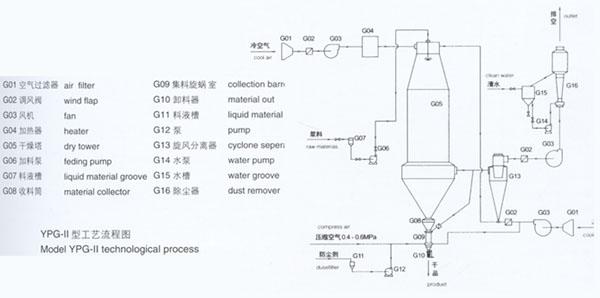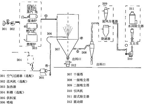 產品概述 本機組干燥機是一種可以同時完成干燥和造粒的裝置。按工藝要求可以調節料液泵的壓力,流量,噴孔的大小,得到所需的按一定大小比例的球形顆粒。 本機組工作過程為料液通過隔膜泵高壓輸入,噴出霧狀液滴,然后同熱空氣并流下降,大部分粉粒由塔底排料口收集,廢氣及其微小粉末經旋風分離器分離,廢氣由抽風機排出,粉末由設在旋風分離器下端的授粉筒收集,風機出口處還可裝備二級除塵裝置,回收率在96-98%以上。 本機組干燥機與物料接觸部分的塔體、管道、分離器的材料,均采用SUS304制作。在塔體內部與外殼之間有足夠的保溫層,填充材料為超細玻璃棉,塔體設有觀察門、視鏡、光源及控制儀表,由電氣控制操作臺控制和顯示。 本機組的熱源裝置采用蒸汽加熱或電加熱器,具有操作方便、啟動快、結構緊湊、熱風干凈清潔等優點。另外在電氣控制柜內裝有電加熱器的控制調節裝置,使進口溫度無級調節。對于缺電地區可采用蒸汽加熱或燃煤、燃油熱風爐等方式,局部或全部代替電加熱裝置。本廠可提供根據用戶的實際需要的各種加熱方式。